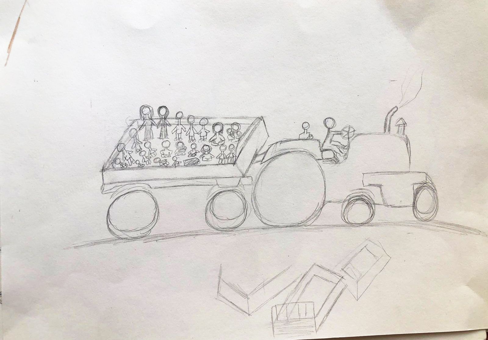 So we had to get on the tractor. There were more than 60 people on board. I remember my legs felt numb as I stood all the way from the mountain till we reached the border with Syria. Loads of other young men and women standing. My younger sister was so scared, and hungry and from the heat too she started gagging and throwing up.
